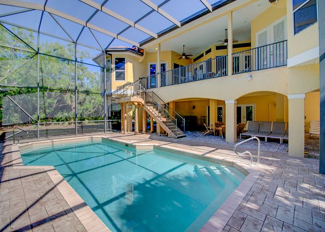 Once Upon A Tide offers 4 bedroom & 3 bathrooms and is located in the Beachview Country Club Estates neighborhood. The home comes equipped with a Sonos system, a wireless home sound system, great for streaming all your favorite music apps. The living room TV is hooked up to the local cable company, the master bedroom TV has Roku, and the guest rooms are equipped with an Apple TV for all your streaming pleasures. The home offers a spacious floor plan, cathedral ceilings, large enclosed lanai, eat-in kitchen, a pool table, tons of natural light & so much more! The master bedroom offers King bed and direct access to the lanai, a sitting area, walk-in closets, garden tub, separate shower and his & her sinks. The 3 guest bedrooms allow for sleeping up to 8 people max in the home with 2 Queen beds & 2 Twin beds. An easy access staircase from the upper deck leads you down to an oversized patio area for sunning around the pool as well as large shaded lounging area with an additional outdoor dining table. This outdoor space is designed for maximum entertainment & overlooks lush landscaping for privacy. Come to Sanibel and make this home your tropical paradise!
